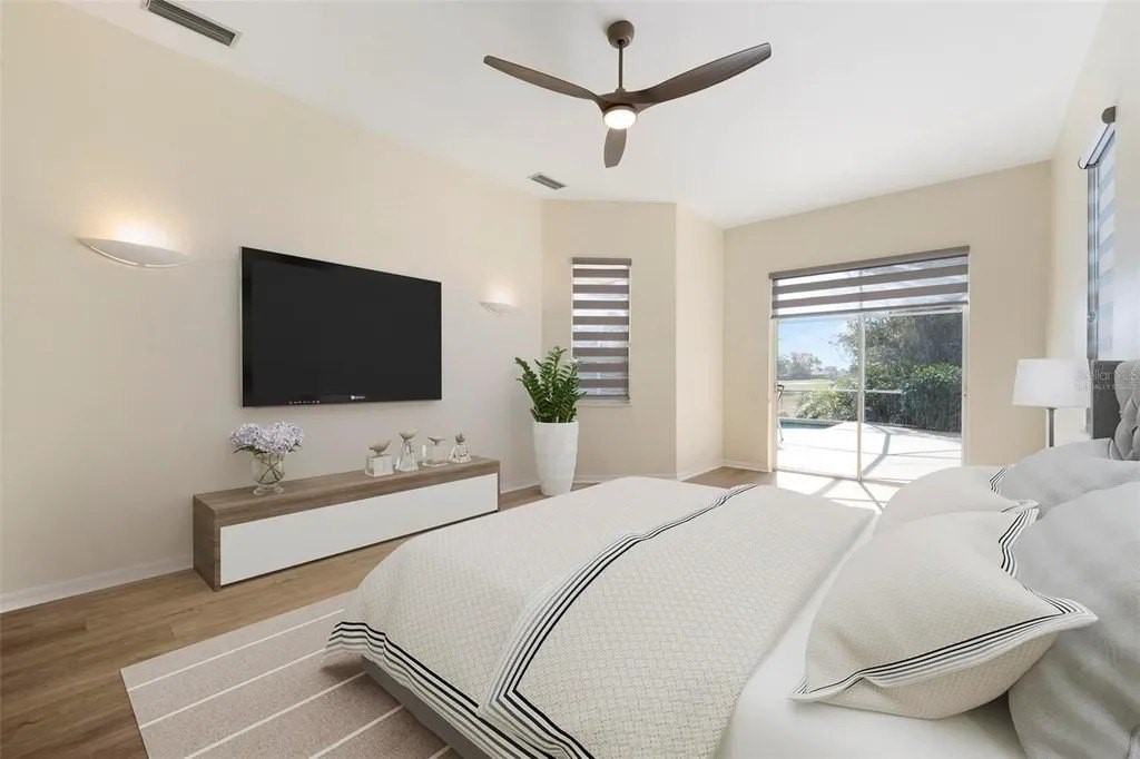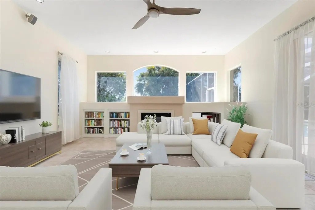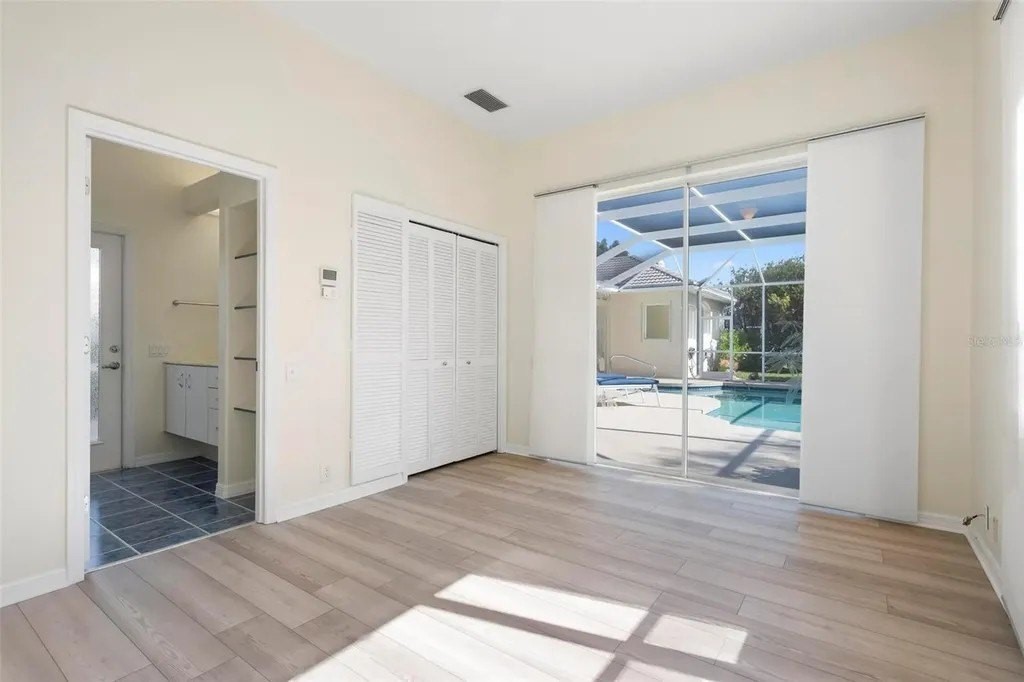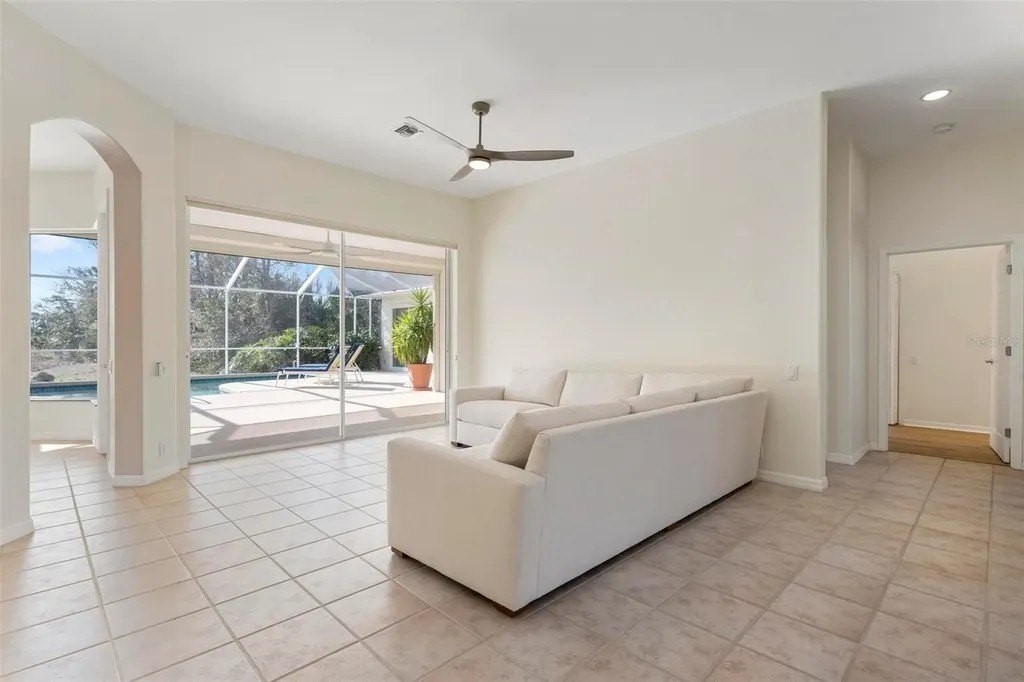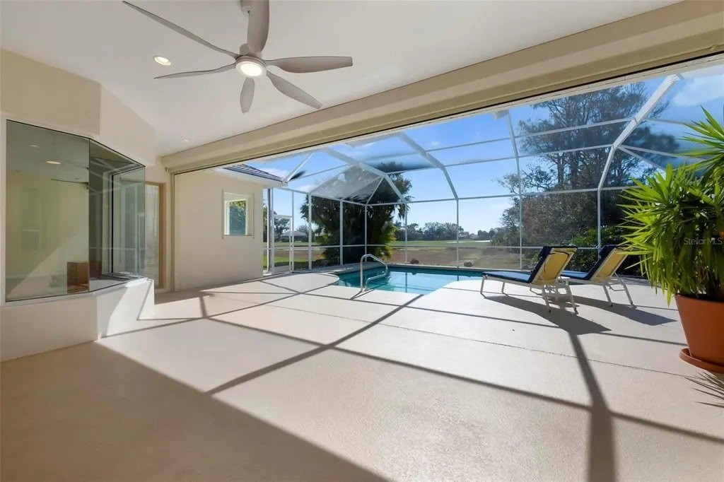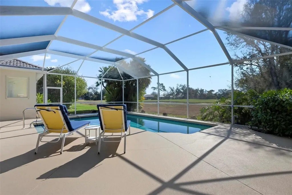 One or more photo(s) has been virtually staged. A serene, view-filled retreat where refined architecture meets effortless indoor outdoor living, framed by water, golf, and wooded views. Offering 2,900 sq. ft. with 3 bedrooms and 3½ baths, including a poolside en-suite casita ideal for guests or in-law use. Volume ceilings enhance both formal and casual living spaces, complemented by a built-in study and a contemporary European-style kitchen with premium appliances, granite counters, and a breakfast bar. An aquarium window frames tranquil pool and nature views. The spacious family room features a fireplace and natural media wall. The remodeled primary suite offers dual walk-in closets and a spa-style bath with soaking tub and frameless glass shower, while guest baths are similarly updated with quality finishes. Outdoor living is designed for privacy and entertaining, with expansive covered areas, a built-in grill, heated pool with new equipment, and a rescreened lanai for year-round enjoyment. In addition to interior renovations, recent mechanical and structural upgrades include two HVAC systems, all new pool equipment, pool enclosure screening, interior and exterior paint, Storm Smart Kevlar hurricane protection, hurricane-rated garage door, hot water tank, whole-house water filtration, and a kitchen water filter. Located in Pelican Pointe Golf & Country Club, residents enjoy clubhouse dining with no minimums, fitness center, heated community pool, tennis, new pickleball courts, 24/7 guard entry, and HOA fees that include lawn care, cable, and high-speed internet. Optional 27-hole golf membership or pay-as-you-play. Just minutes from Venice Island beaches, boating, dining, boutiques, and cultural venues.