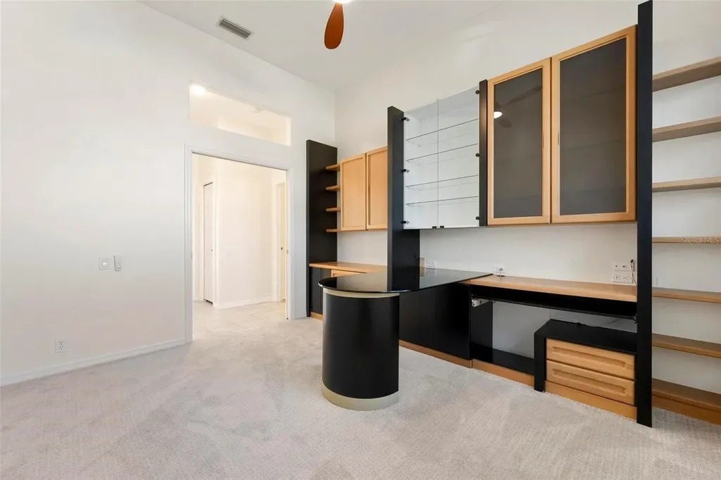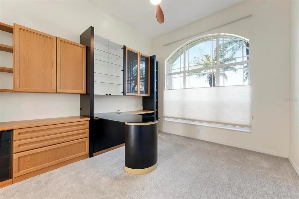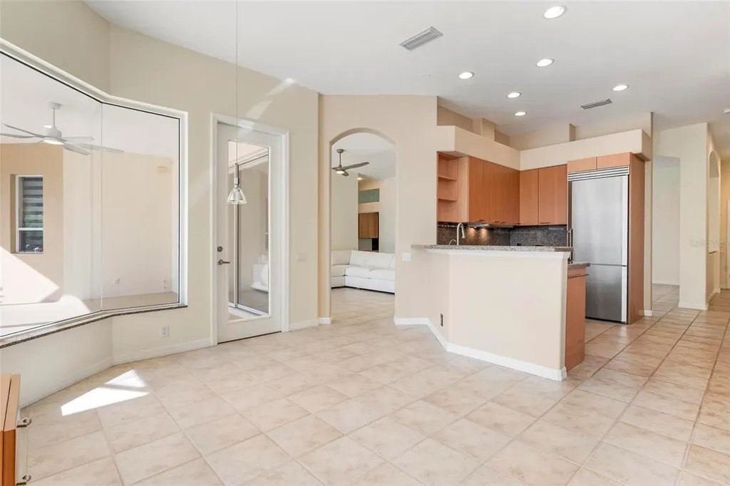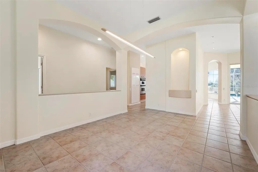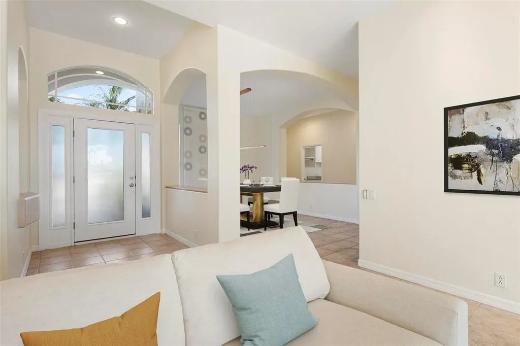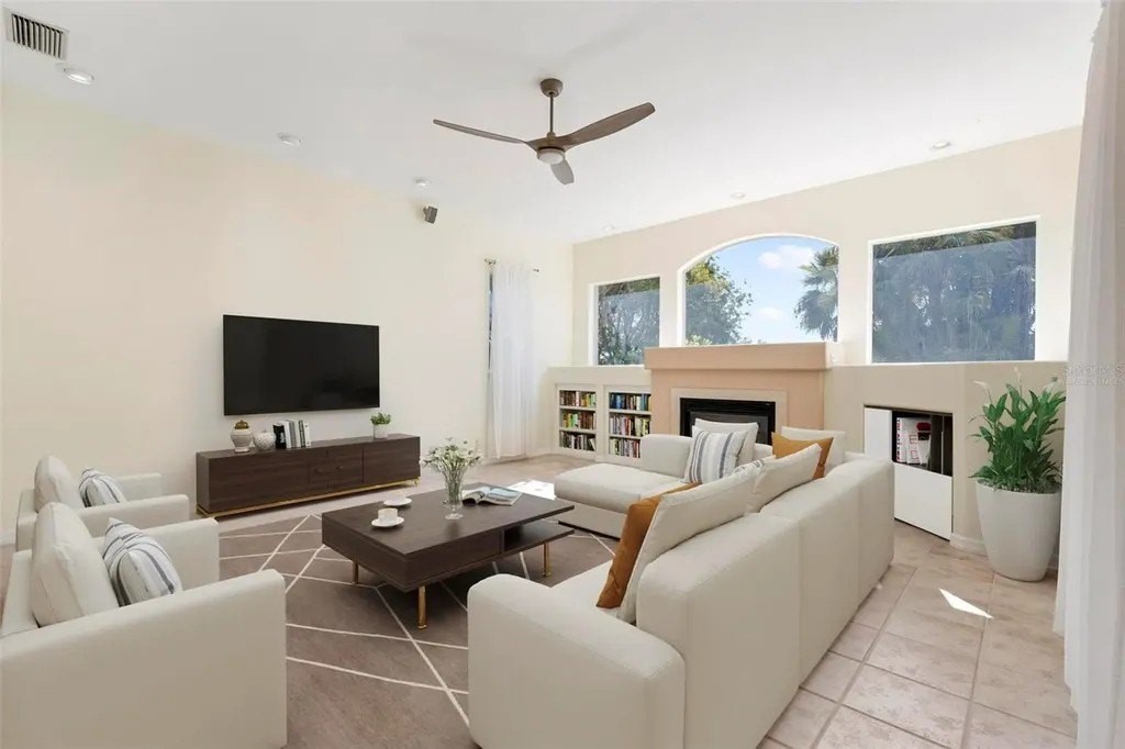 One or more photo(s) has been virtually staged. A serene, view-filled retreat where refined architecture meets effortless indoor outdoor living, framed by water, golf, and wooded views. Offering 2,900 sq. ft. with 3 bedrooms and 3½ baths, including a poolside en-suite casita ideal for guests or in-law use. Volume ceilings enhance both formal and casual living spaces, complemented by a built-in study and a contemporary European-style kitchen with premium appliances, granite counters, and a breakfast bar. An aquarium window frames tranquil pool and nature views. The spacious family room features a fireplace and natural media wall. The remodeled primary suite offers dual walk-in closets and a spa-style bath with soaking tub and frameless glass shower, while guest baths are similarly updated with quality finishes. Outdoor living is designed for privacy and entertaining, with expansive covered areas, a built-in grill, heated pool with new equipment, and a rescreened lanai for year-round enjoyment. In addition to interior renovations, recent mechanical and structural upgrades include two HVAC systems, all new pool equipment, pool enclosure screening, interior and exterior paint, Storm Smart Kevlar hurricane protection, hurricane-rated garage door, hot water tank, whole-house water filtration, and a kitchen water filter. Located in Pelican Pointe Golf & Country Club, residents enjoy clubhouse dining with no minimums, fitness center, heated community pool, tennis, new pickleball courts, 24/7 guard entry, and HOA fees that include lawn care, cable, and high-speed internet. Optional 27-hole golf membership or pay-as-you-play. Just minutes from Venice Island beaches, boating, dining, boutiques, and cultural venues.